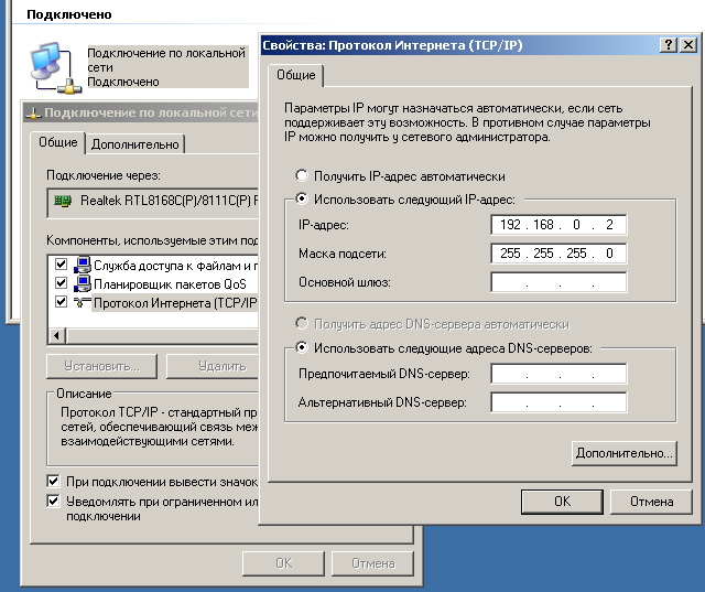 Для этого на компьютере заходим Пуск - Панель управления - Сетевые подключения. Нажимаем правую кнопку мышки на иконке Подключение по локальной сети и левой кнопкой мыши, в открывшемся меню, выбираем Свойства. После этого заходим в свойства Протокол Интернета TCP/IP и вбиваем IP-адрес: 192.168.0.2 и маску подсети: 255.255.255.0 (см. скриншот)