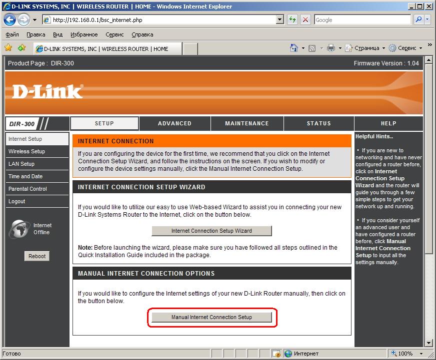 Настраиваем раздел Internet Setup. Для этого необходимо нажать левой кнопкой мыши кнопку Manual Internet Connection Setup (см.скриншот).
