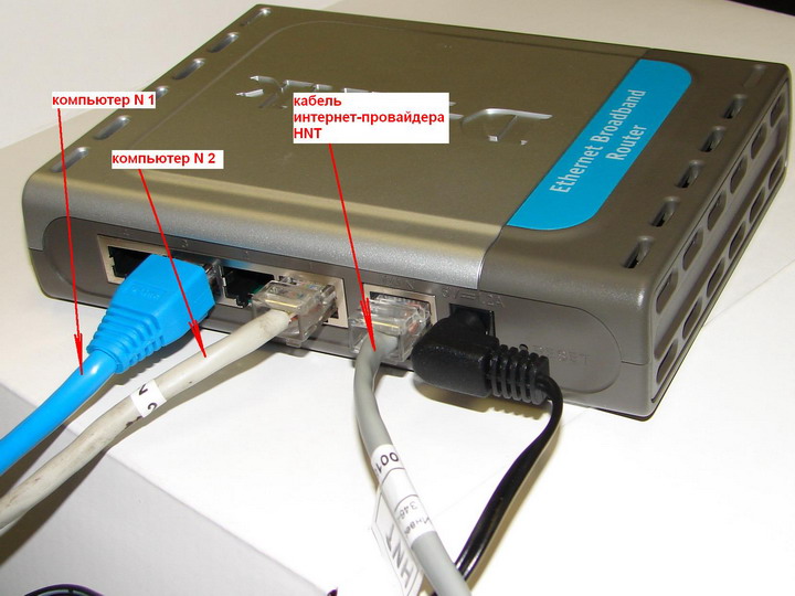 Кабель интернет-провайдера HNT подключаем в разьём WAN интернет-маршрутизатора. (см. фото):