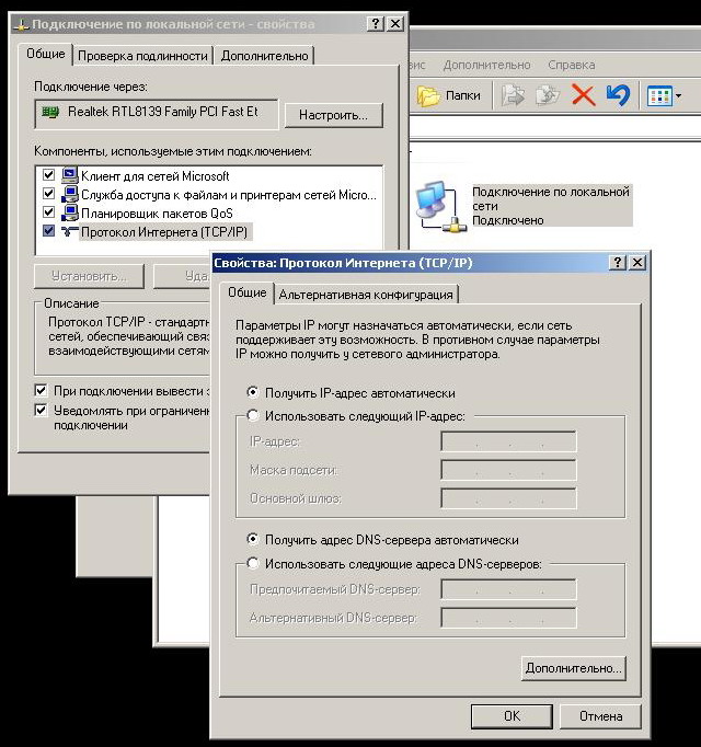 Для этого на компьютере заходимПуск - Панель управления - Сетевые подключения. Далее нажимаем правую кнопку мышки на иконкеПодключение по локальной сети и выбираемСвойства. После этого заходим в свойства Протокола Интернета TCP/IP и выбираем Получить IP-адрес автоматически и Получить адрес DNS-сервера автоматически (см. скриншот)