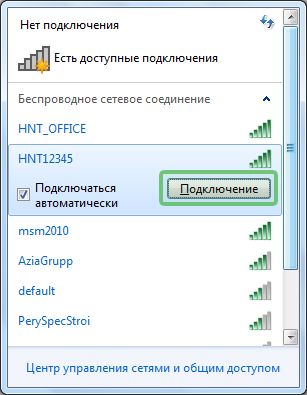 В открывшемся списке обнаруженных беспроводных сетей выбираем нашу беспроводную сеть HNT12345 и нажимаем кнопку Подключение