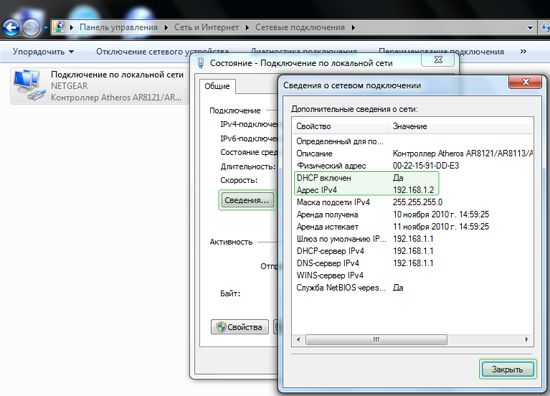 После этого нажимаем OK, далее « Закрыть». Что бы убедится в получение сетевого адреса, нажимаем правую кнопку мышки на иконке Подключение по локальной сети и выбираем Состояние. Затем в открывшемся окне нажимаем кнопку « Сведения…» (см. скриншот)