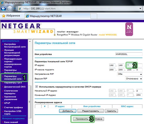 Далее в разделе Дополнительно заходим в подраздел Параметры локальной сети (на скриншоте шаг 1). Этот раздел позволяет поменять IP-адрес интернет-маршрутизатора во внутренней сети (LAN) и определить диапазон адресов автоматически распределяемых роутером внутри сети. Настройку этого раздела можно оставить без изменений. Но поскольку подсеть 192.168.1.0/24 также используется внутри локальной сети HNT, мы рекомендуем изменить ее на подсеть 192.168.7.0/24. Для этого необходимо сделать следующие изменения (шаг 2). И по окончании нажать Применить (шаг 3):