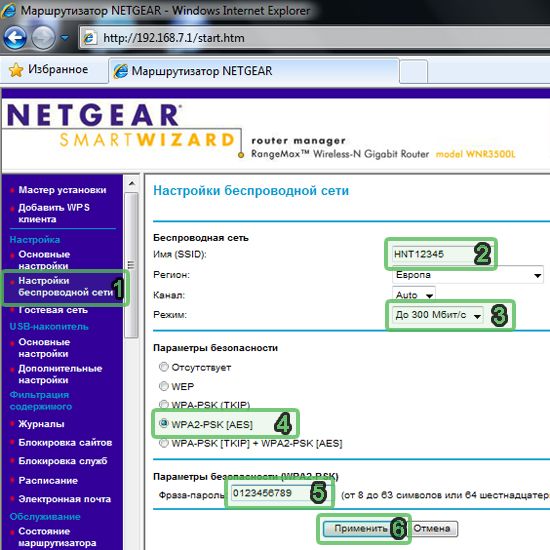 Поменяем имя для беспроводной сети (SSID) с NETGEAR на любое другое, например номер Вашего договора. На скриншоте для примера мы выбрали HNT12345 (шаг 2). Чуть ниже изменим скоростной режим беспроводной сети, выбрав параметр до 300 Мбит/c (шаг 3). Далее в Параметрах безопасности ставим точку напротив типа шифрования: WPA2-PSK[AES] (шаг 4) После этого появится возможность внести фразу-пароль не менее 8 символов. (шаг 5) И применим изменения кнопкой Применить (шаг 6.):