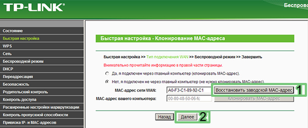 В разделе "Клонирование MAC адреса" выбирите " нет ..." и нажмите на кнопку "Восстановить заводской MAC адрес" и Далее (Next)