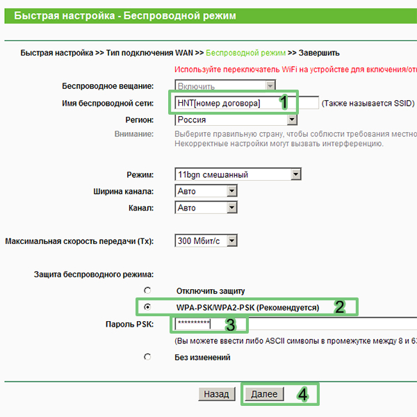 Перейдите к настройкам беспроводной сети "Беспроводной режим" (Wireless). В поле "Имя беспроводной сети" поменяйте имя беспроводной сети на HNT_номер_вашего_договора одним словом. Обязательно проверьте, что включена защита беспроводной сети и выбран тип шифрования WPA-PSK/WPA2-PSK В поле "Пароль PSK" сотрите все звездочки и задайте пароль для вашей домашней беспроводной сети (желательно 10 символов и более). Придумайте Пароль самостоятельно и запомните или сохраните его. В дальнейшем Вы будете его использовать для настройки подключения к маршрутизатору ваших беспроводных устройств. После этого нажмите кнопку Далее (Next)