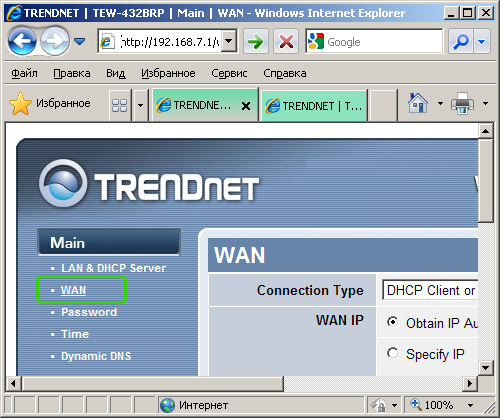 Теперь для продолжения настроки роутера необходимо в адресной строке браузера ввести новый адрес http:\\192.168.7.1 Снова потребуется ввести имя Пользователя: admin и Пароль: admin. Далее в разделе Main выбираем второй подраздел WAN. (см. скриншот):