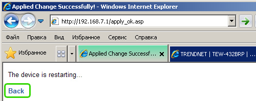 Интернет-маршрутизатор перезагрузиться. И через некоторое врямя можно продолжить его настройку, просто нажав ссылку Back (см. скриншот):
