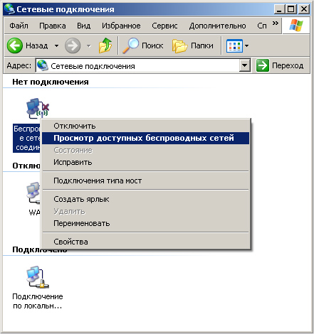 Далее нажимаем правую кнопку мыши на иконке Беспроводное сетевое подключение и в открывшемся меню выбираем Просмотр доступных беспроводных сетей.