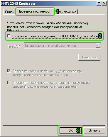В следующем окне выбираем закладкуПроверка подлинности (на скриншоте шаг 1) и снимаем галочку напротивВключить проверку подлинности IEEE 802.1x для этой сети (шаг 2). И нажимаем кнопкуОК (шаг 3).
